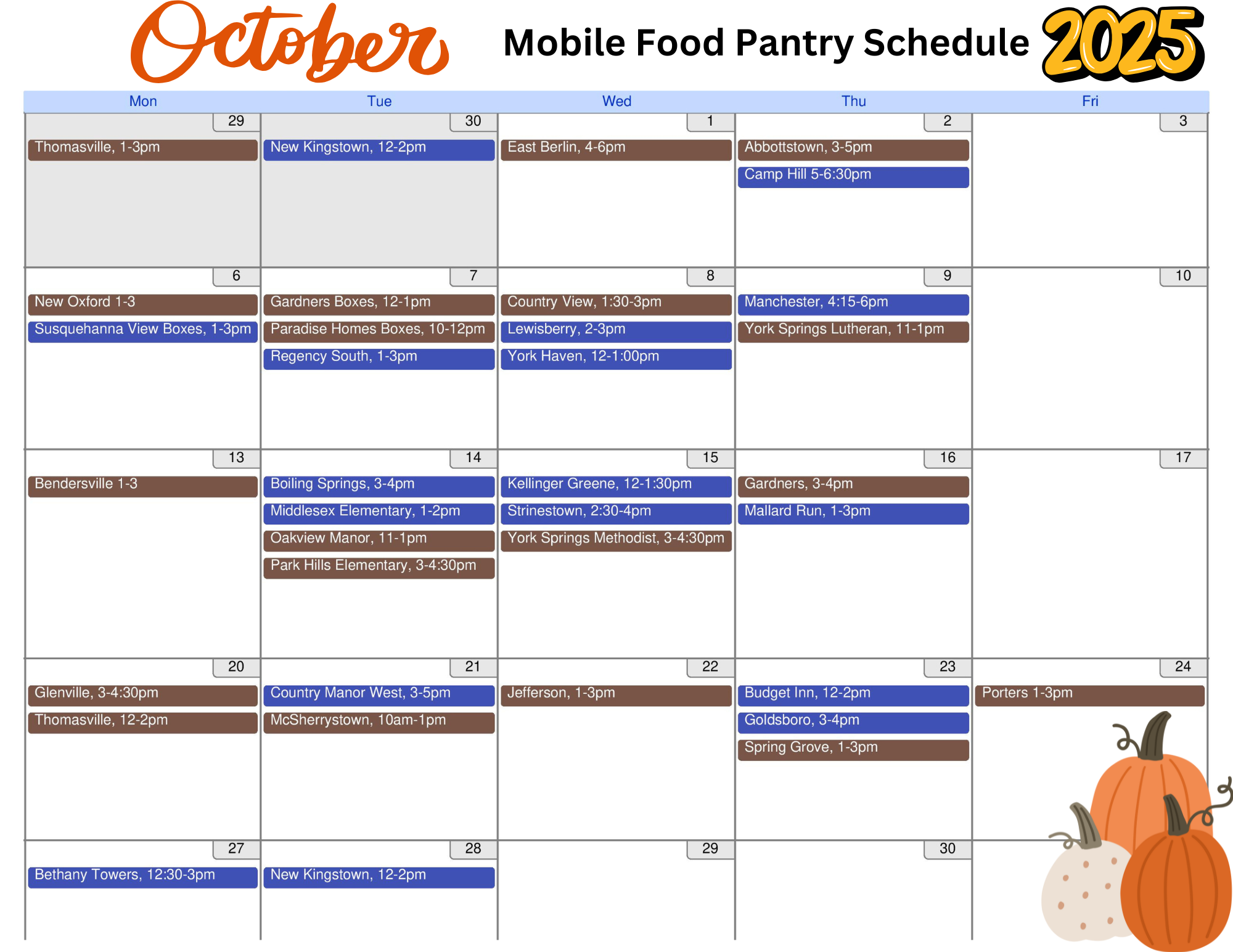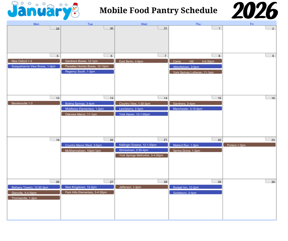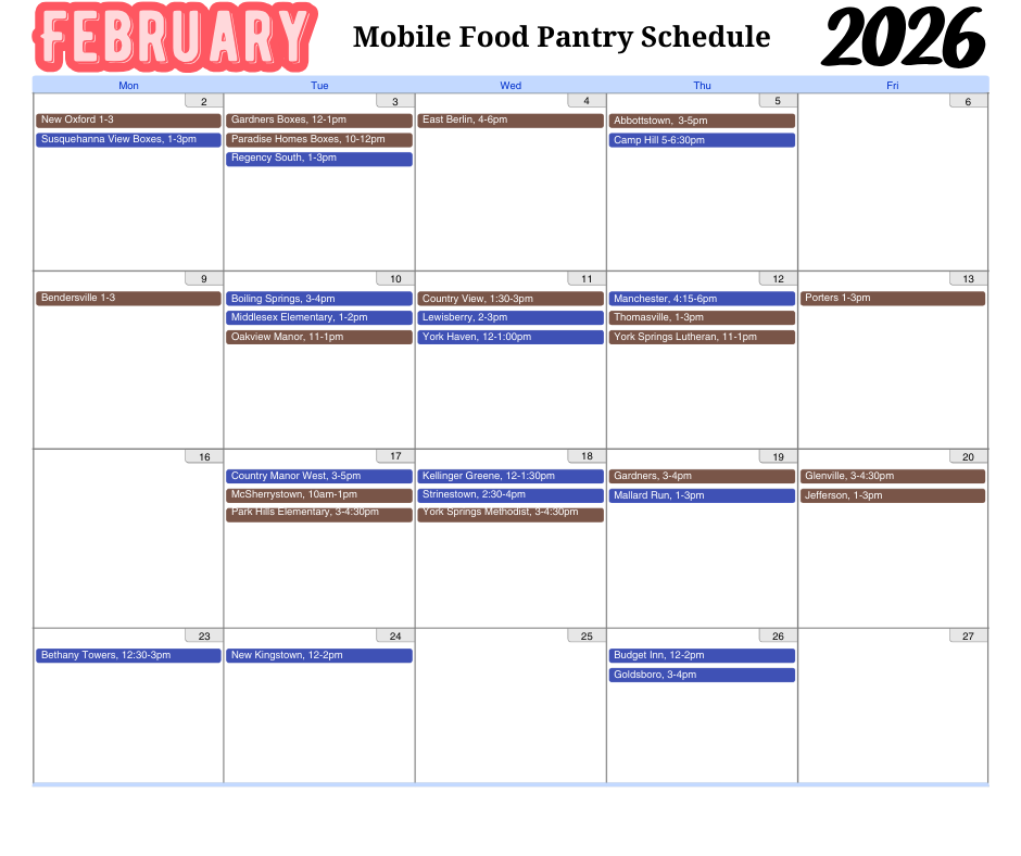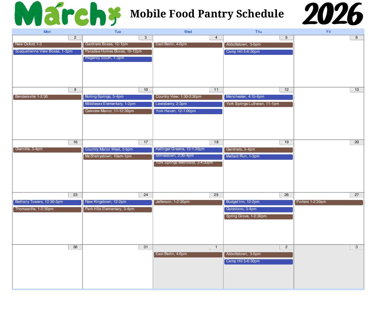 Manages mobile pantry locations highlighted in brown on calendars below.