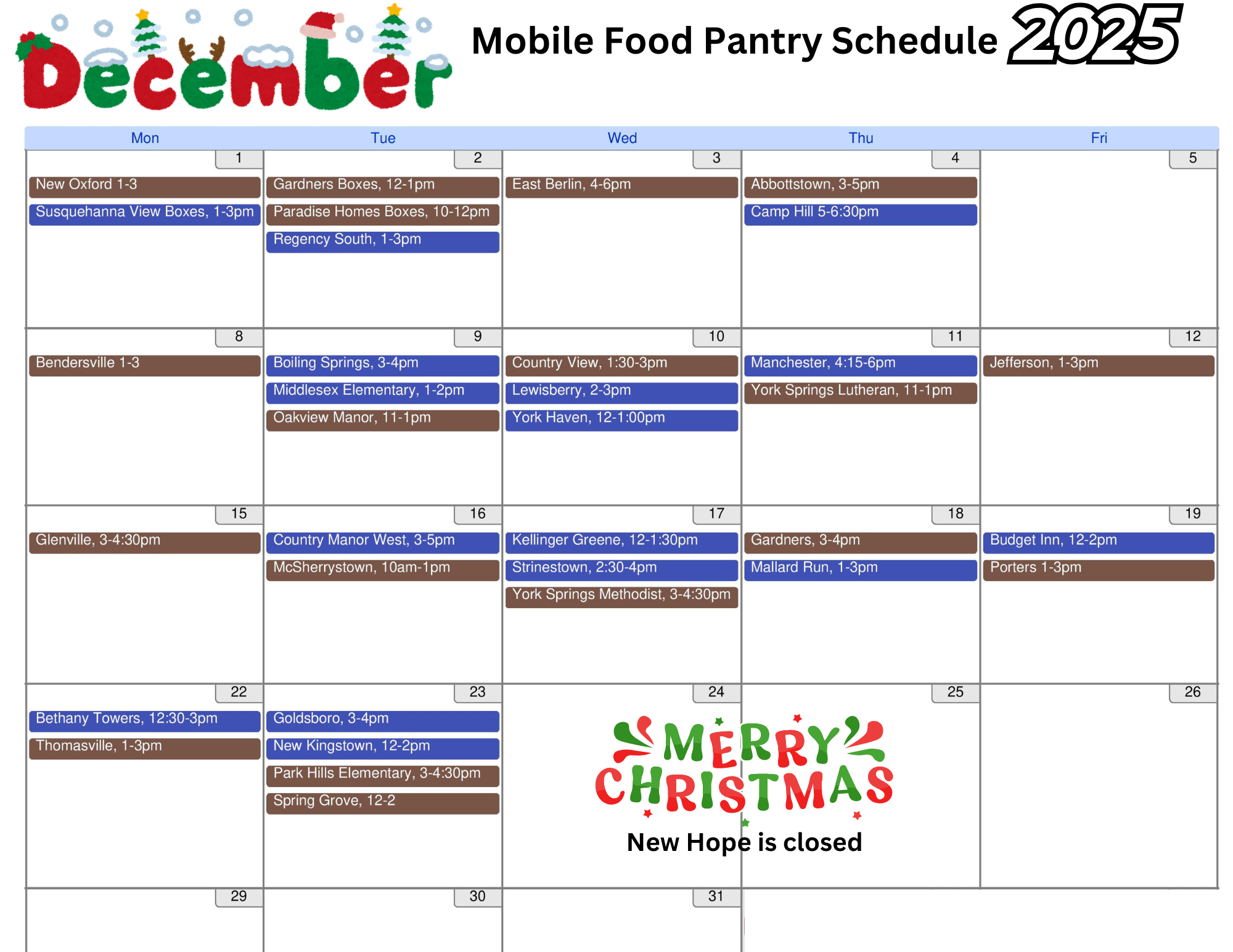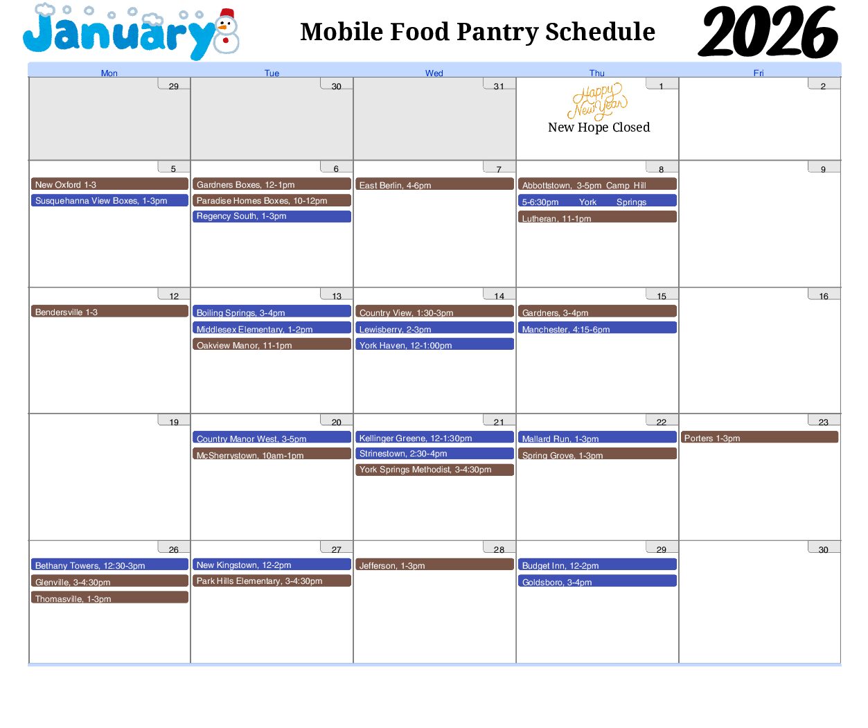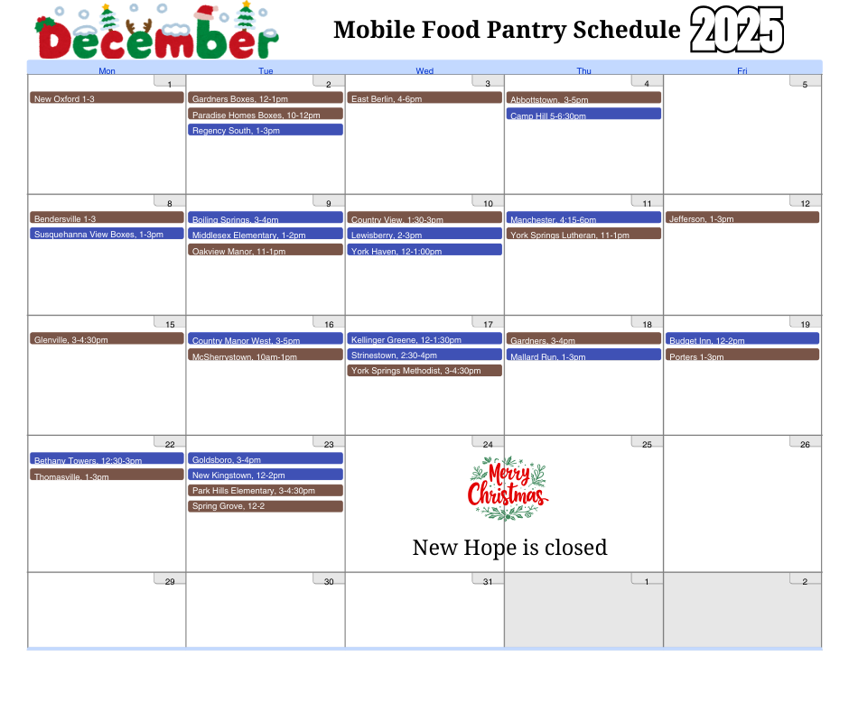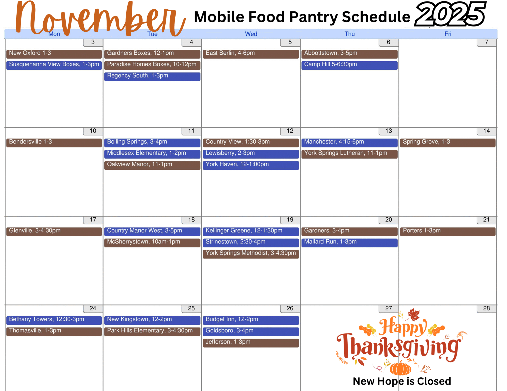 Manages mobile pantry locations highlighted in brown on calendars below.