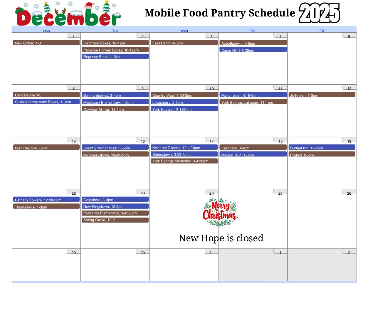 Mobile Food Pantry – New Hope Ministries’ mobile food pantry provides our guests the opportunity to receive food when they cannot get to one of our Centers.